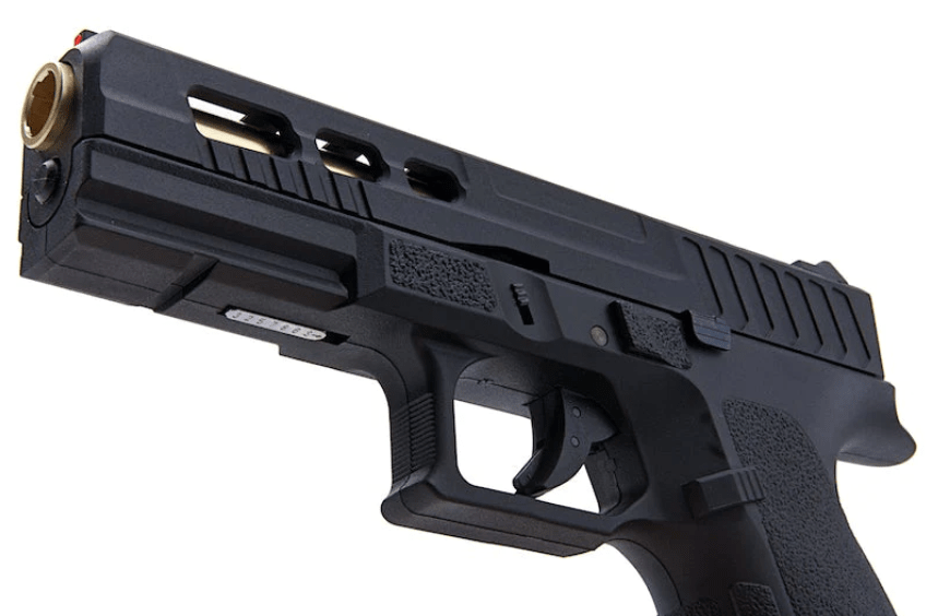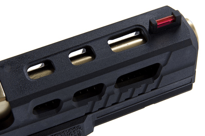 La corredera es de metal, mecanizada CNC, con un bonito acabado mate. Las miras son fijas, y el punto de mira de la replica tiene una fibra de agua ligera que hace que apuntar sea mucho más rápido y preciso.